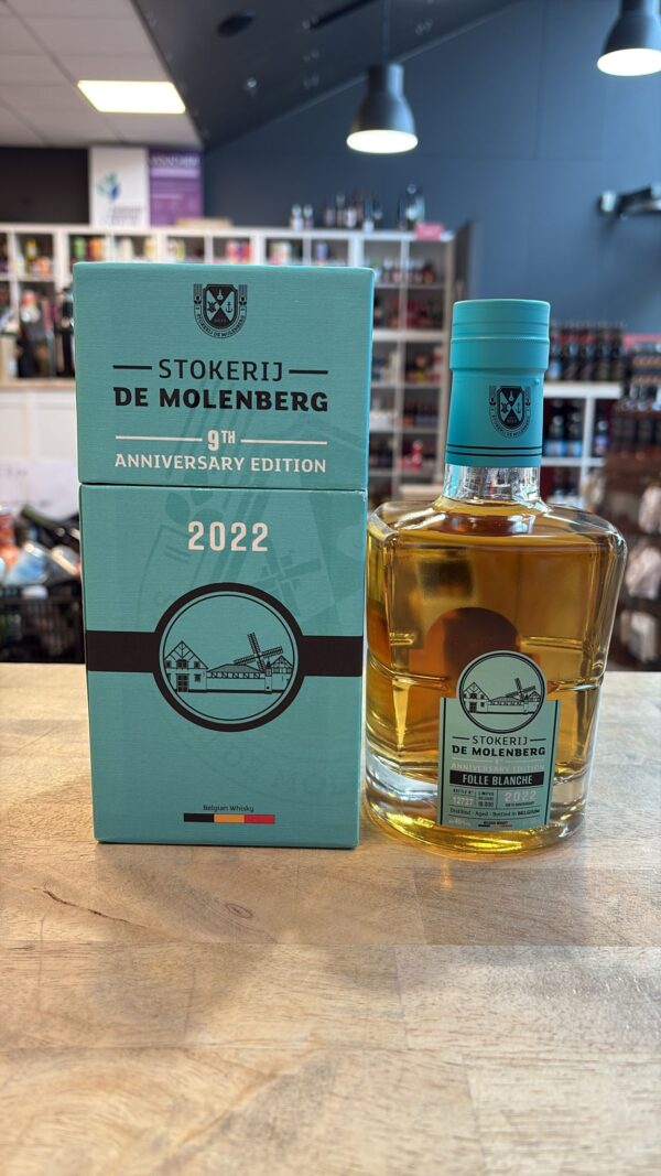 Folle Blanche is een gelimiteerde vrijgave ter gelegenheid van de 9e verjaardag van Stokerij De Molenberg. Folle Blanche is een Franse witte druivensoort waaruit cognac gemaakt wordt. De hoge zuurtegraad van deze druif komt in distillaten tot uiting in de verfijnde, geparfumeerde aroma’s. Deze whisky rijpte eerst op Bourbon en Anker vaten, gevolgd door een langdurige finish van drie jaar op cognacvaten. Die geven tijdens de rijping volmondige toetsen van hout en vanille vrij.